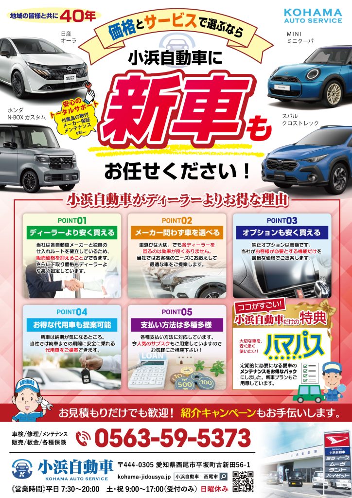 リースではなく、車検や必要なメンテナンスを含み月々定額のお支払いで新車に乗れる小浜自動車のプランです。